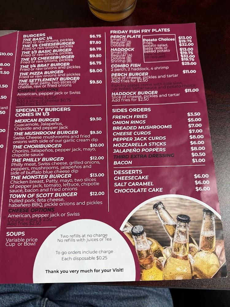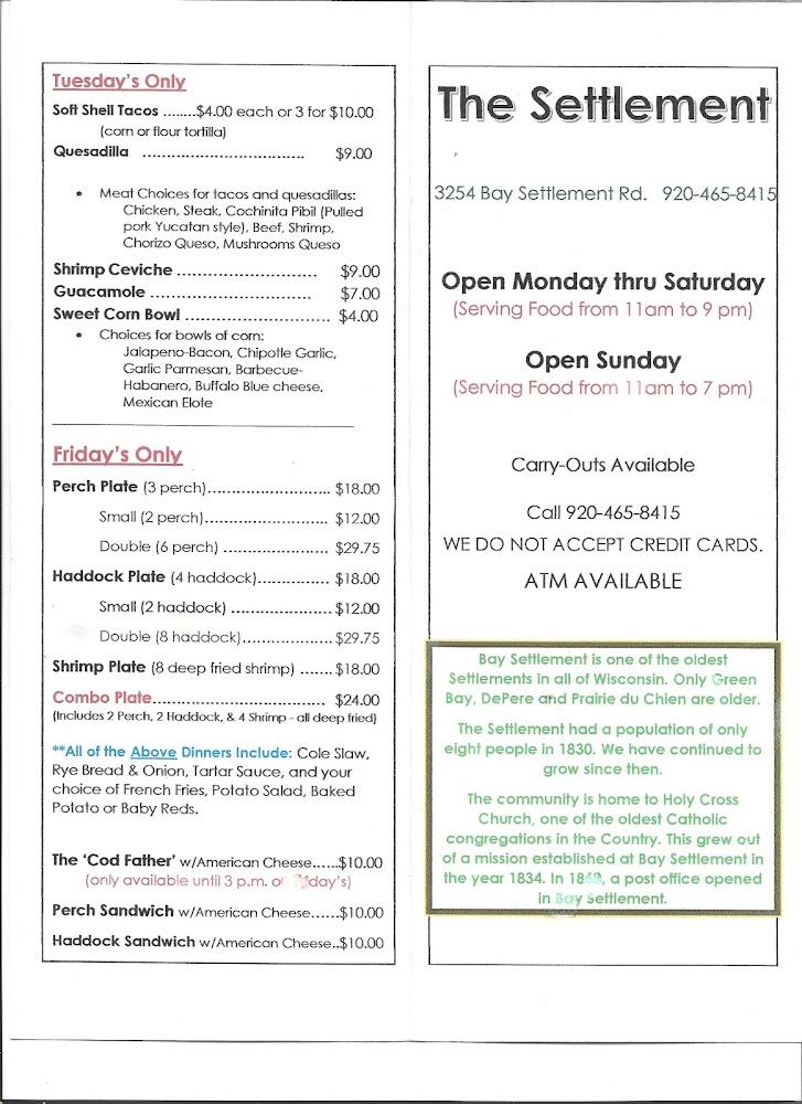 Welcome to The Settlement Bar & Grill, a cherished historical gem located on the Eastside of Green Bay. Renowned for our delectable fish fry and classic old fashions, we pride ourselves on offering a warm and inviting atmosphere perfect for families and friends. Enjoy a diverse menu featuring great food, excellent cocktails, and a wide selection of beers, all served by our friendly staff. Whether you're dining solo, catching a game, or celebrating with a group, we cater to all. Join us for a memorable meal and experience our cozy ambiance that keeps guests coming back for more!