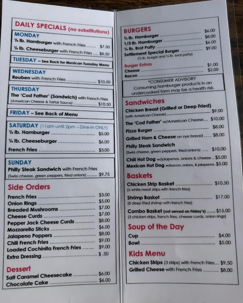 The menu features a robust selection of classic dishes. Diners can indulge in perfectly breaded fish on the famous fish fry night, along with a choice of potato sides.